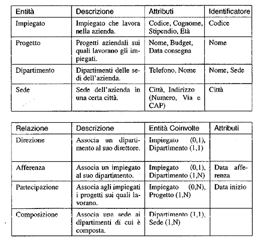 - cardinalità delle relazioni: vengono specificate per ciascuna partecipazione di entità a una relazione; dicono quante volte (numero massimo e numero minimo), in una relazione tra entità, un’occorrenza di una entità può essere legata a occorrenze delle altre entità coinvolte (g. relazione ASSEGNAMENTO tra entità IMPIEGATO e INCARICO: se diciamo che IMPIEGATO ha cardinalità minima 1 e cardinalità massima 5, vogliamo dire che a un impiegato deve essere assegnato almeno 1 incarico ma non più di 5. Se diciamo che INCARICO ha cardinalità minima 0 e cardinalità massima 50, vogliamo dire che un certo incarico può essere assegnato o a nessun impiegato o a un numero inferiore o uguale a 50).