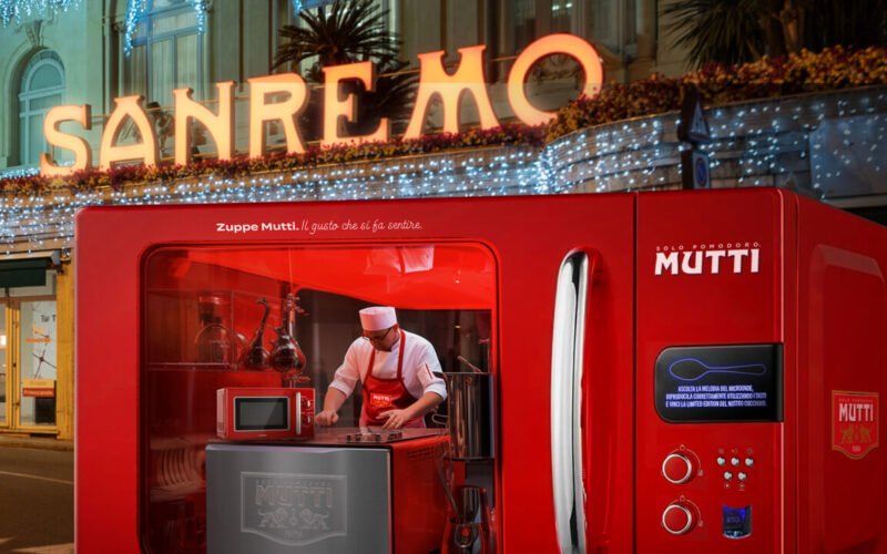 Un trenino brandizzato ha accompagnato i turisti nei luoghi simbolo della città di Sanremo, terminando le corse a Forte San Tecla con una degustazione delle zuppe Mutti. Al Casinò, l’azienda ha poi installato un finto microonde abbastanza grande da ospitare le performance di un DJ-Chef, che metteva musica preparando i prodotti ready-to-use del brand e distribuendo gadget.