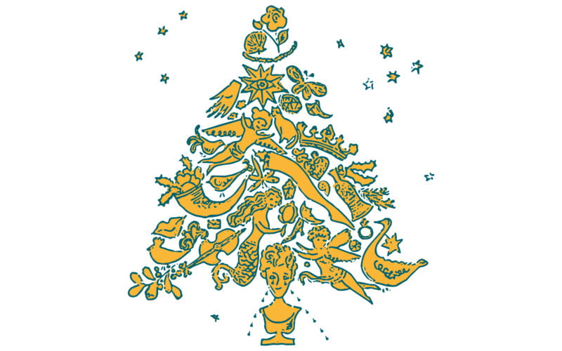 Quest’anno c’è forse poco da festeggiare, per il clima di violenza che penetra più dimensioni della nostra vita, pubblica e privata, tra conflitti internazionali e femminicidi all’ordine del giorno. Per questo, nella sua reinterpretazione del Christmas Tree di Andy Wharol, disegnato nel 1957 per illustrare i biglietti di auguri di Tiffany & Co, la nostra Valeria Morando ha fatto piangere il mezzo busto di donna.